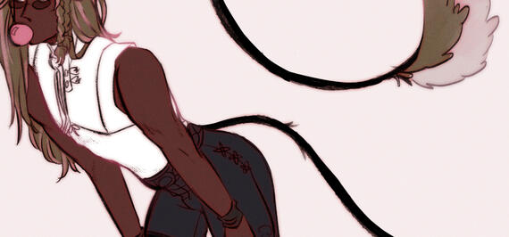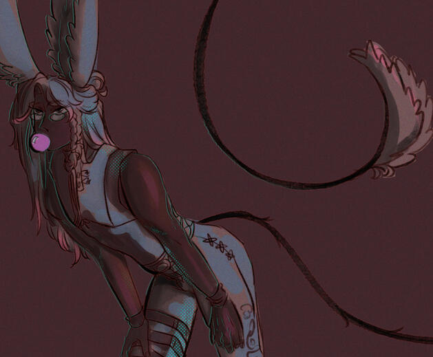 | An accident has left him mostly blind in both eyes, and he wears custom polarizing lenses to dim the effects of the white artifacts blocking out his vision. Elia uses his tail a lot to get a feel for the space around him. |